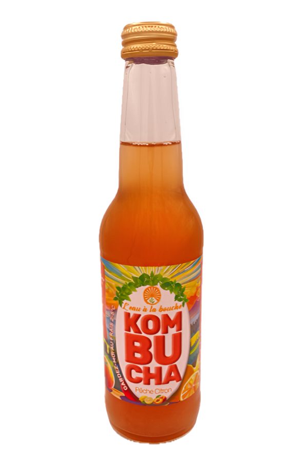 Eau de source filtrée, sucre de canne* (Brésil), Pêche de vigne (France), jus de citron (Espagne), fleurs d’hibiscus*, thé noir* et thé vert* (Les jardins de Gaia), Arôme de pêche*, culture de kombucha*